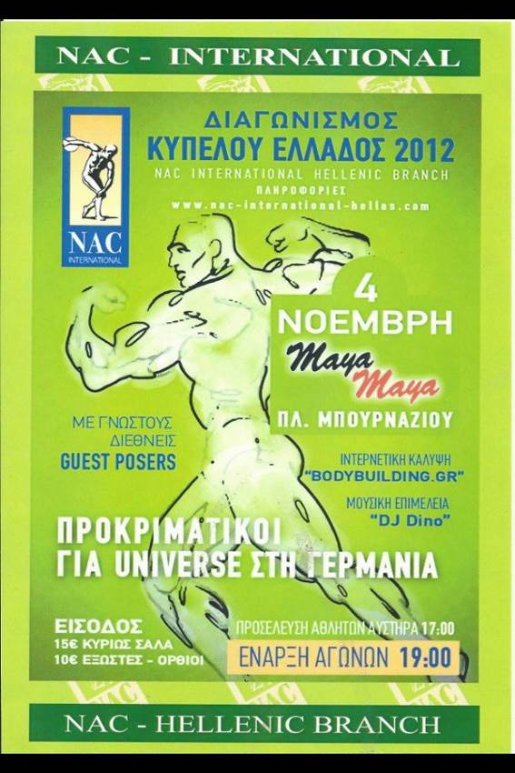 Tην Κυριακή 4 Νοεμβρίου 2012 διοργανώνεται το Κύπελλο Ελλάδος της NAC σε έναν καταπλητικό χώρο, στο "MAYA MAYA" στην πλατεία Μπουρναζίου στο Περιστέρι. Με συμμετοχές πολύ μεγάλων αθλητών όπως ο Πιστόλας, ο Μανώλης, ο Τζιλόπουλος και μια μεγάλη έκπληξη στην επαγγελματική κατηγορία. Η διοργάνωση της ΝAC μας επιφειλάσει πολλές εκπλήξεις με διεθνείς guest posers. Στα decks o dj Dino. Η διοργάνωση δίνει πρόκριση για το Ms. & Mr. Universe 2012 της NAC στη Γερμανία.